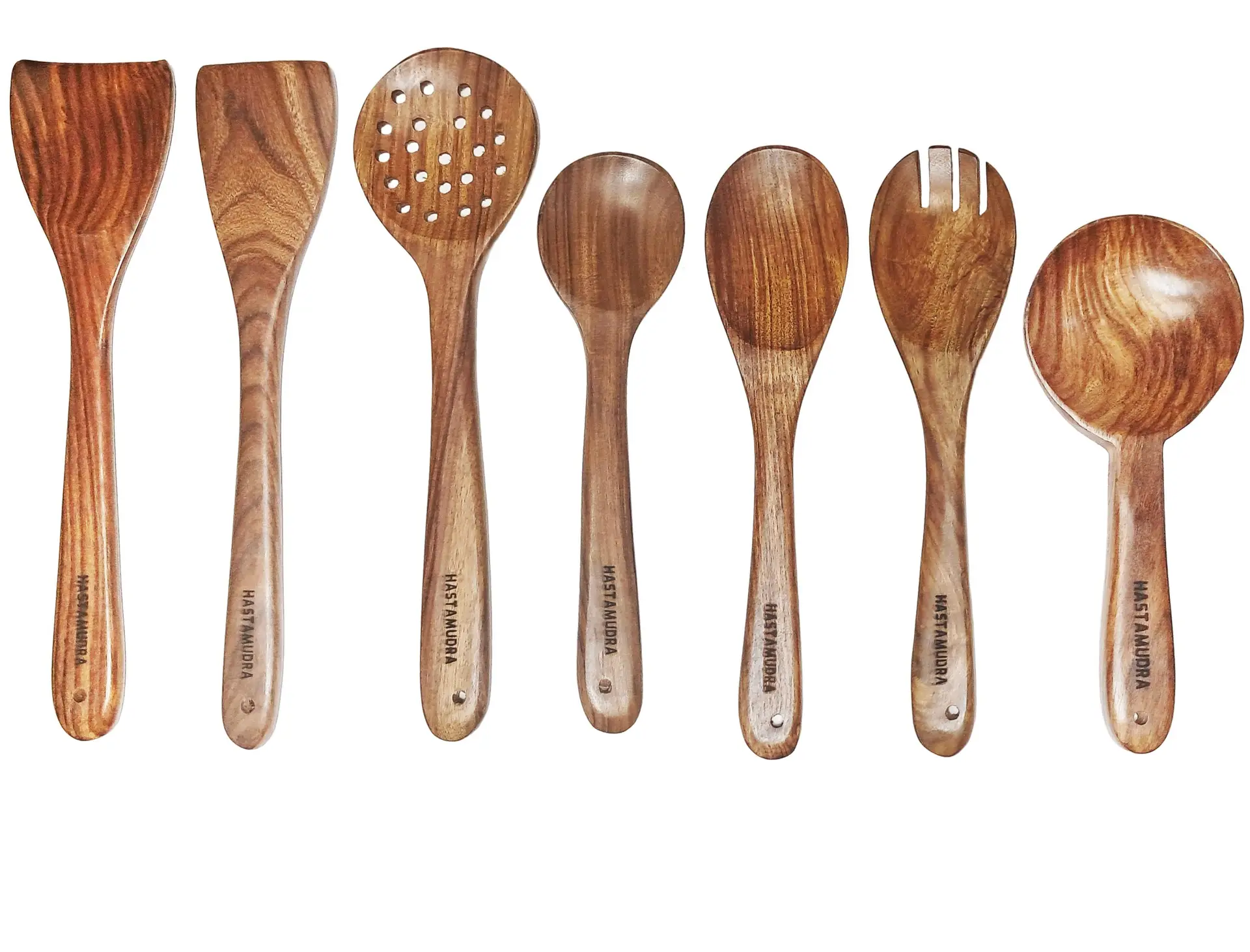 8 Piece Wooden Spoon Set for Cooking & Serving – Nonstick, Ideal for Chapati, Dosa, Rice, Dal, and Frying – Includes Heavy Masher – No Added Color or Polish